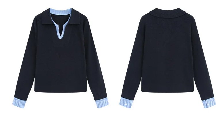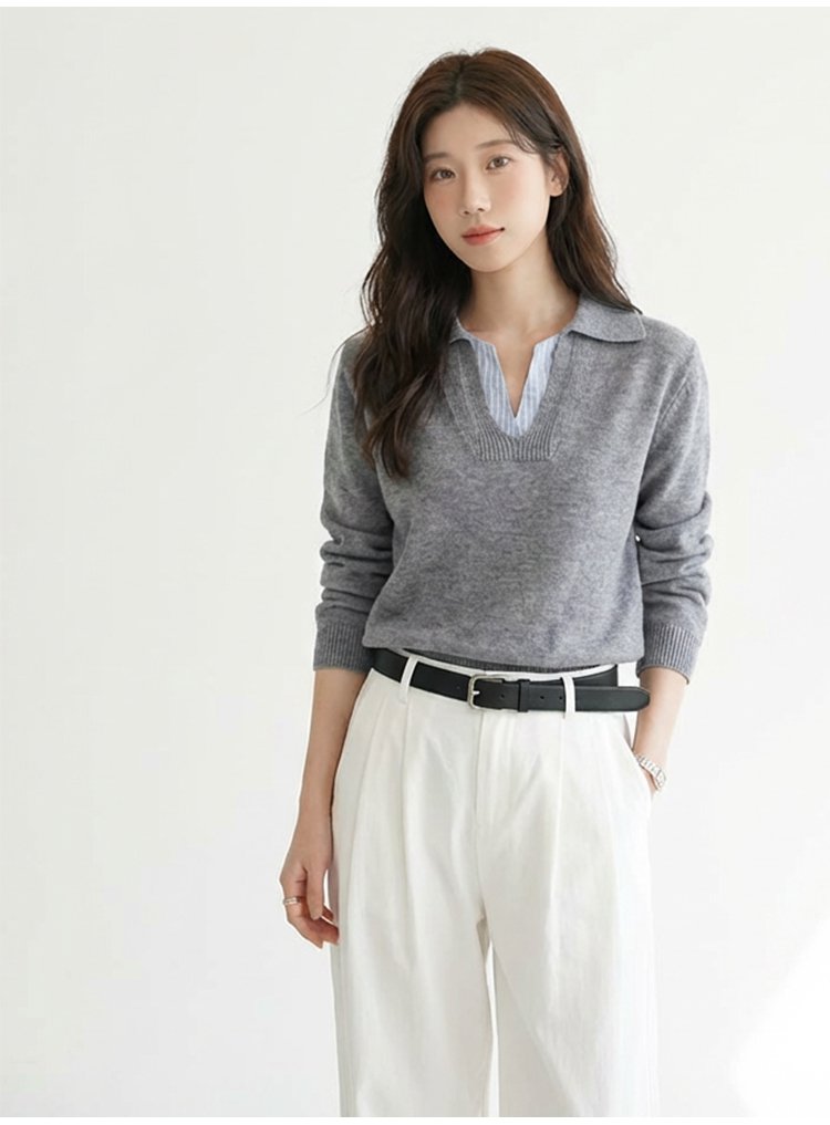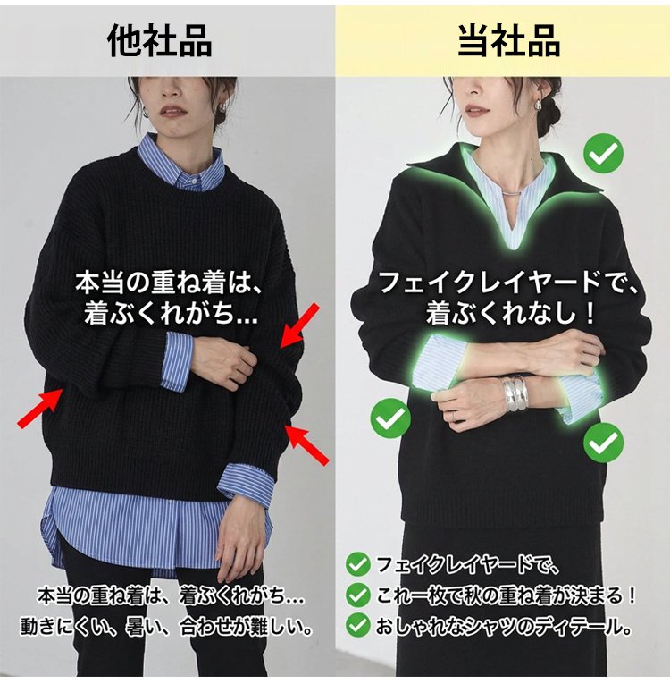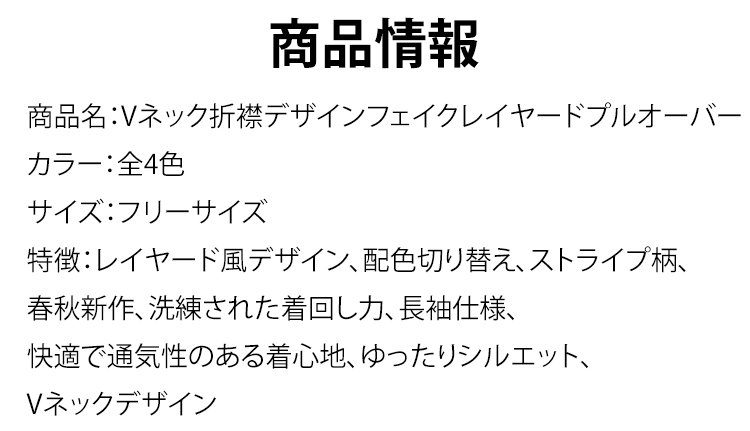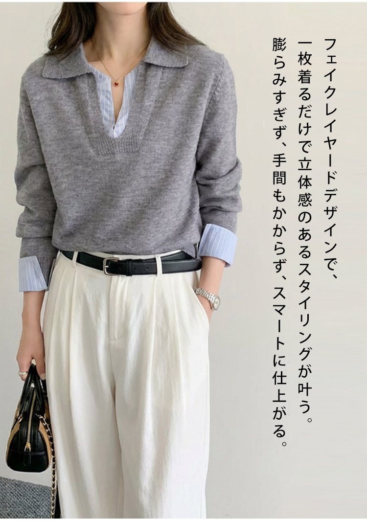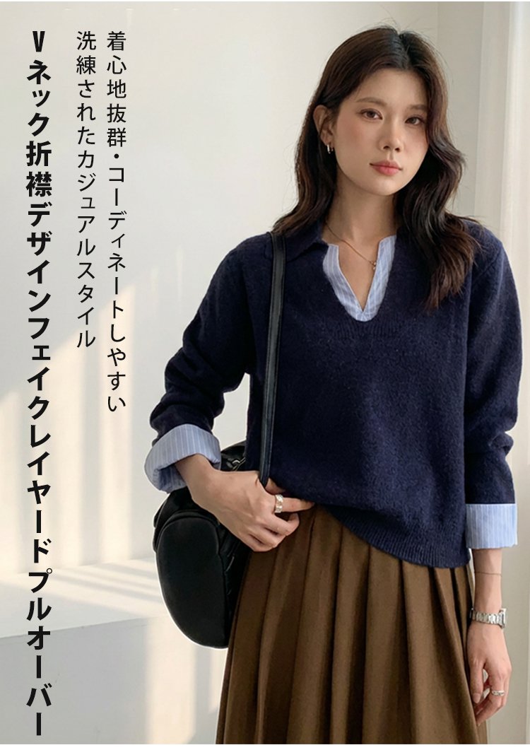 Vネック折襟デザインフェイクレイヤードプルオーバー