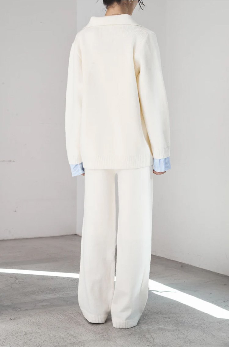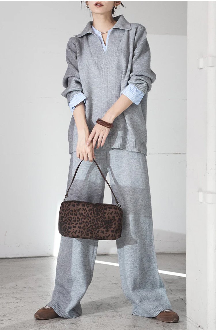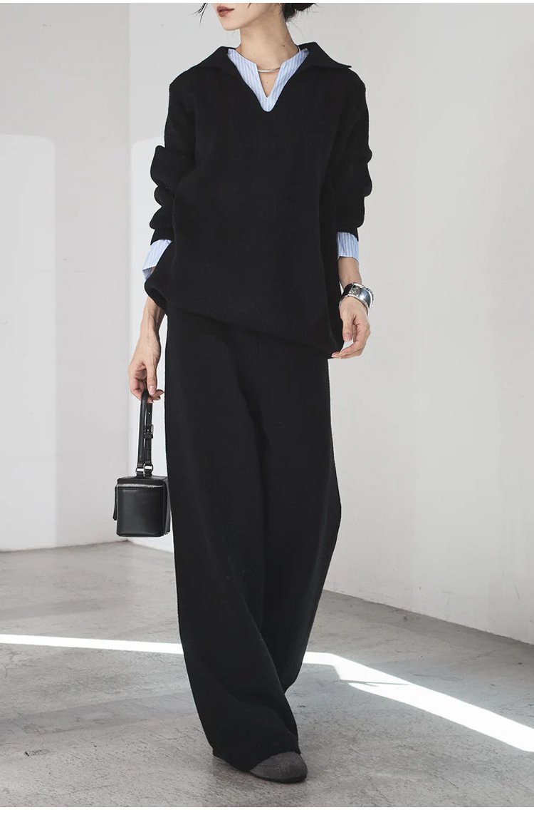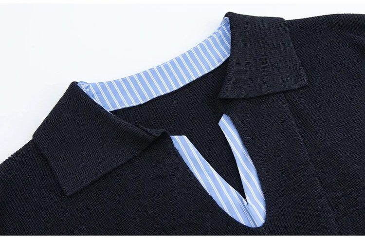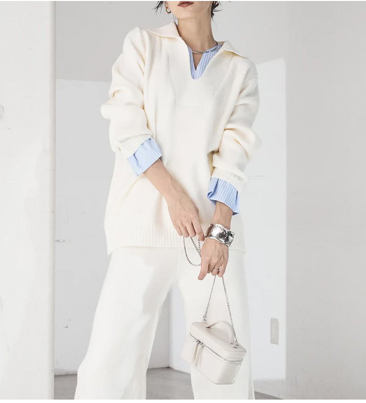 Vネック折襟デザインフェイクレイヤードプルオーバー
